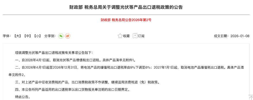 On January 8, 2026, the Ministry of Finance of China issued the “Announcement on Adjusting the Export Tax Rebate Policies for Photovoltaic and Other Products” (hereinafter referred to as the “Announcement”), declaring that the 13% export tax rebate rate for certain manufactured goods, including some e-cigarette products, will be eliminated effective April 1, 2026.
